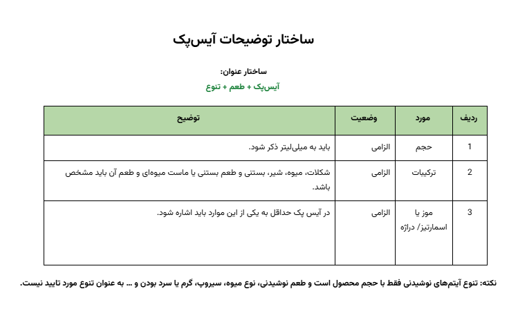 نکته: اشاره به طعم به کار رفته در عنوان الزامی است در صورتی که نام محصول به گونه ای بود که از عنوان محتویات و طعم آن مشخص نبود حتما در توضیحات به جزئیات آن اشاره شود.