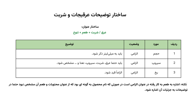 نکته: در صورتی که از عنوان نوشیدنی ماهیت و مواد تشکیل دهنده آن مشخص نمی شد، باید همه ترکیبات آن در توضیحات مشخص و آورده شود. مثل آبمیوه معجون.
