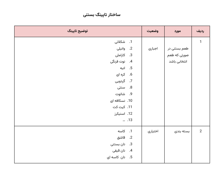 توجه: برخی محصولات شاید در بیش از یک دسته قرار گیرند (مانند قهوه)، اما اولویت و جزئیات مورد نیاز برای هر دسته متفاوت است. برای مثال، اطلاعات قهوه در سرویس «کافه» اهمیت بیشتری دارد. در ادامه با ساختارهای محتوایی بیشتر آشنا خواهید شد.