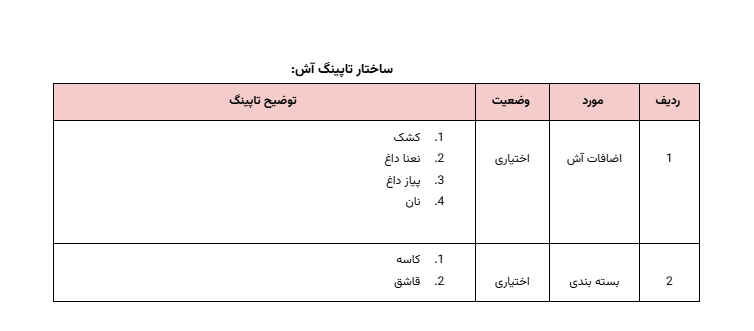 برای دسته آش و حلیم در منوی اسنپفود، ارائه عنوان و توضیحات دقیق و جذاب نقشی کلیدی در جلب توجه مشتریان و کمک به انتخاب بهتر دارد. با استفاده از یک ساختار منسجم و روشن برای معرفی انواع آش و حلیم، مواد اولیه، افزودنیها و حجم محصول، تجربه خرید برای مشتریان سادهتر و دلپذیرتر میشود.