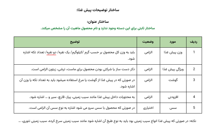 برای اطمینان از هماهنگی و کیفیت محتوا، جدول زیر استانداردهای لازم برای توضیحات محصولات دسته ایرانی را به ترتیب اولویت نشان میدهد.