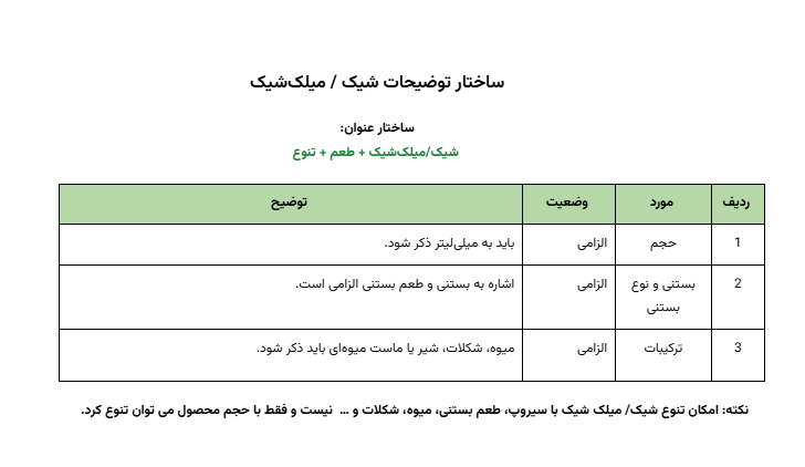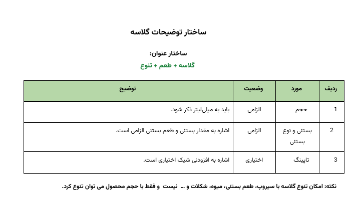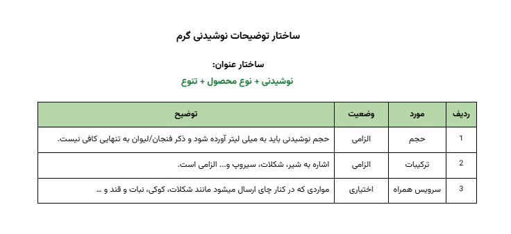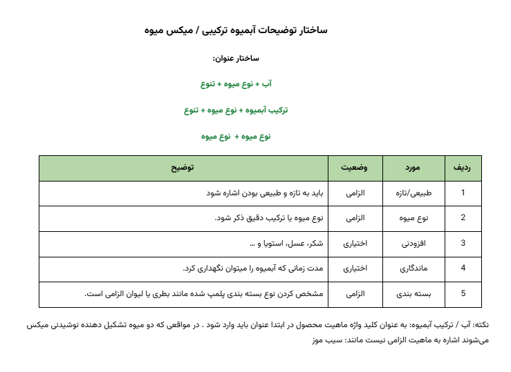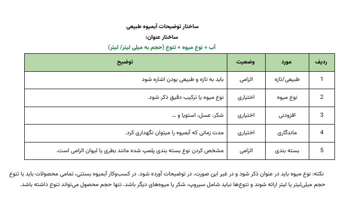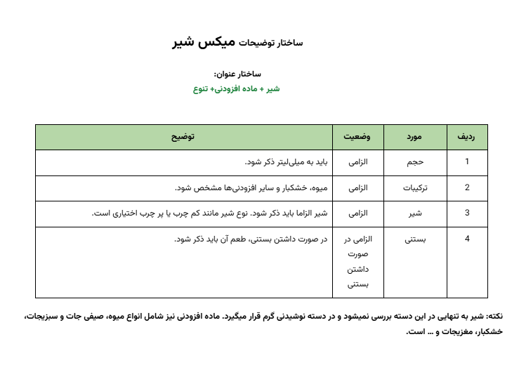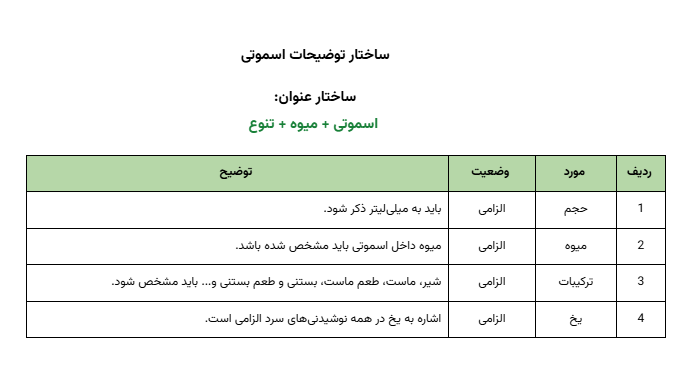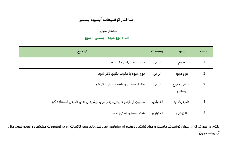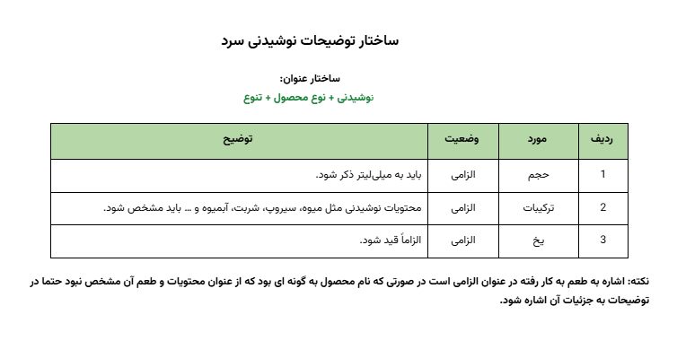 نکته: در صورتی که از عنوان نوشیدنی ماهیت و مواد تشکیل دهنده آن مشخص نمی شد، باید همه ترکیبات آن در توضیحات مشخص و آورده شود. مثل آبمیوه معجون.