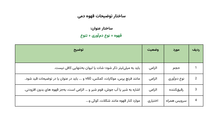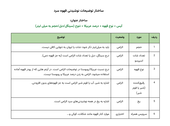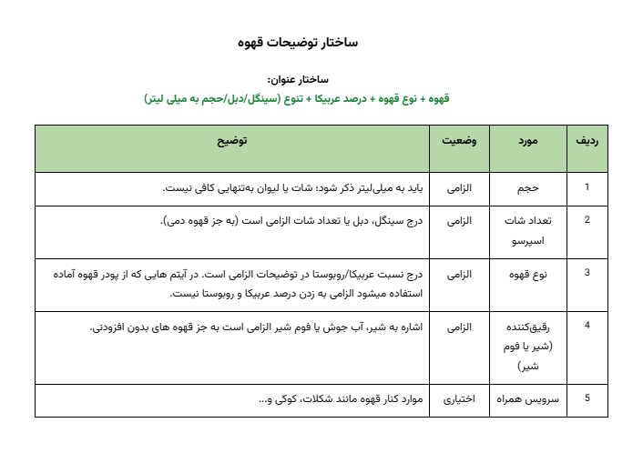 جزئیاتی مانند نوع قهوه، درصد عربیکا (در صورت وجود تنوع)، و متریک اندازهگیری (سینگل، دبل یا حجم به میلیلیتر) باید بهطور شفاف درج شوند. برای اطمینان از هماهنگی و کیفیت محتوا، جدول زیر استانداردهای لازم برای توضیحات محصولات دسته قهوه را به ترتیب اولویت نشان میدهد.