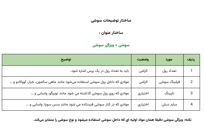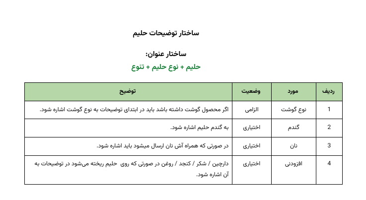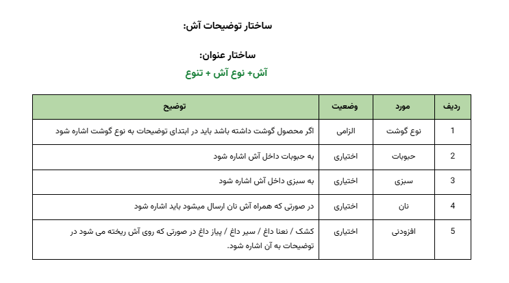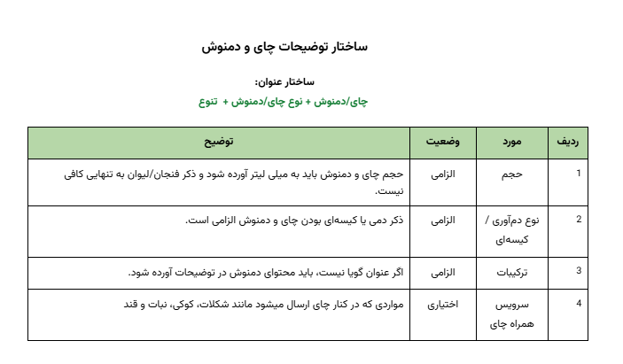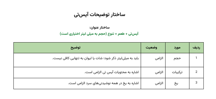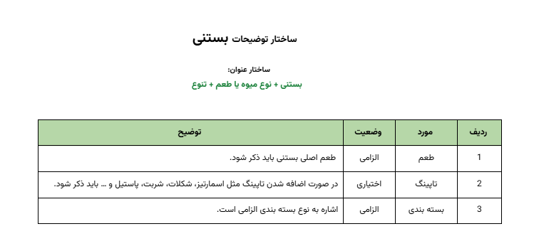 برای اطمینان از هماهنگی و کیفیت محتوا، جدول زیر استانداردهای لازم برای توضیحات محصولات دسته ایرانی را به ترتیب اولویت نشان میدهد.