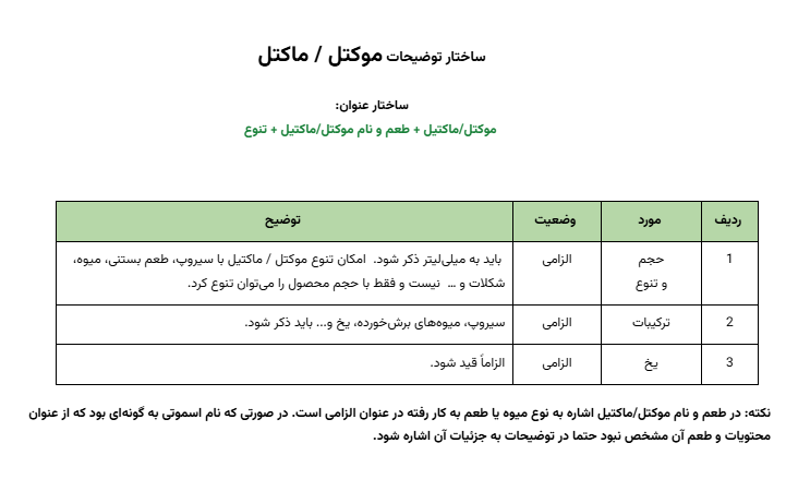نکته: در طعم و نام موکتل/ماکتیل اشاره به نوع میوه یا طعم به کار رفته در عنوان الزامی است. در صورتی که نام اسموتی به گونهای بود که از عنوان محتویات و طعم آن مشخص نبود حتما در توضیحات به جزئیات آن اشاره شود.