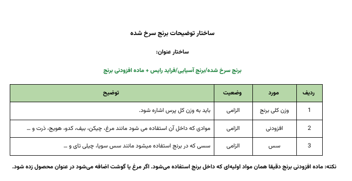 عنوان هر محصول باید با ساختار مشخص و یکدست نوشته شود تا مشتری بهراحتی ماهیت، نوع گوشت، ویژگی و تنوع آن را تشخیص دهد. جزئیاتی مثل نوع برنج، نوع و تعداد سیخ کباب، وزن گوشت و برنج و افزودنیها یا دورچین باید شفاف و دقیق ثبت شوند.