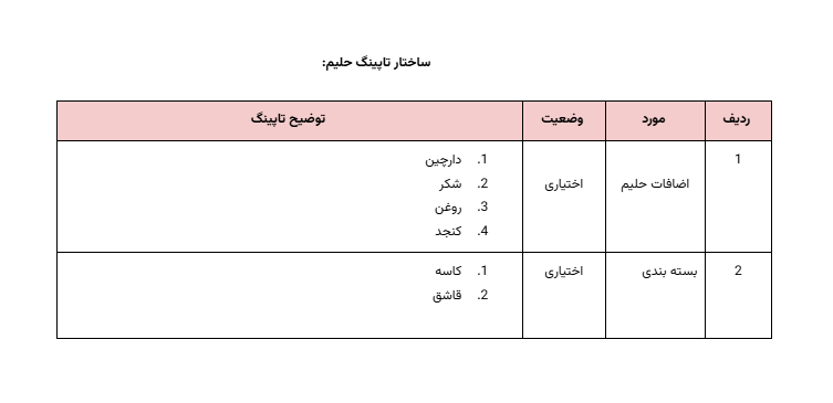 برای دسته آش و حلیم در منوی اسنپفود، ارائه عنوان و توضیحات دقیق و جذاب نقشی کلیدی در جلب توجه مشتریان و کمک به انتخاب بهتر دارد. با استفاده از یک ساختار منسجم و روشن برای معرفی انواع آش و حلیم، مواد اولیه، افزودنیها و حجم محصول، تجربه خرید برای مشتریان سادهتر و دلپذیرتر میشود.