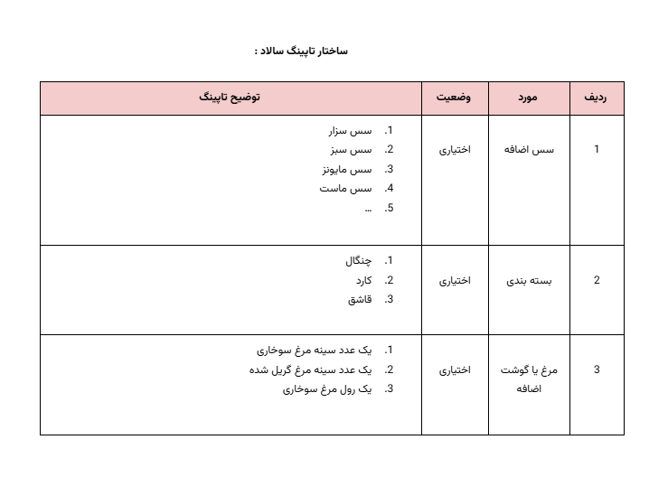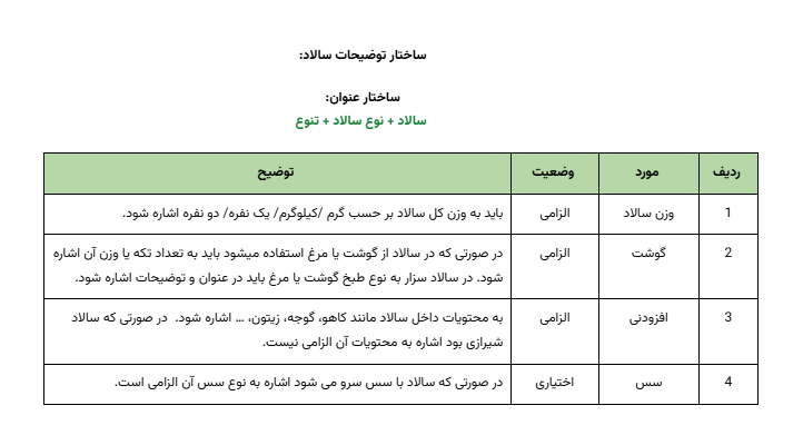بهطور مثال، عنوان هر سالاد باید بهطور واضح نوع سالاد، مواد اصلی و ویژگیهای آن را مشخص کند تا مشتری بتواند بهراحتی با محصول آشنا شود. همچنین در توضیحات، باید بهطور کامل به وزن، نوع گوشت، افزودنیها و سسهای موجود اشاره شود.