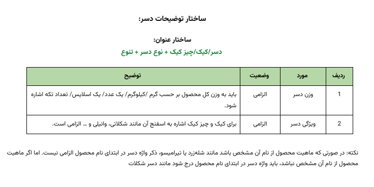 نکته: اشاره به طعم به کار رفته در عنوان الزامی است در صورتی که نام محصول به گونه ای بود که از عنوان محتویات و طعم آن مشخص نبود حتما در توضیحات به جزئیات آن اشاره شود.